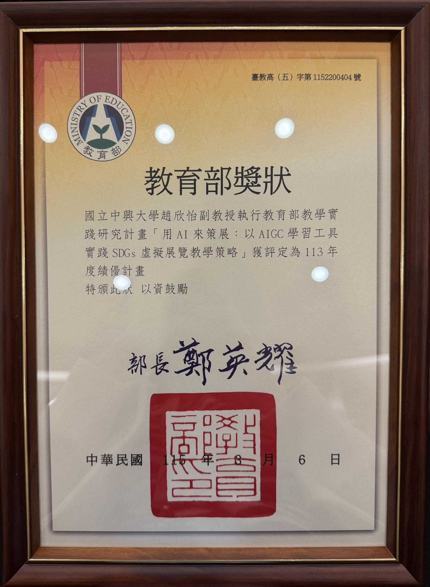 恭賀!本系趙欣怡副教授執行教育部教學實踐研究計畫「用AI來策展:以AICG學習工具實踐SDGs虛擬展覽教學策略」獲評定為113年度績優計畫